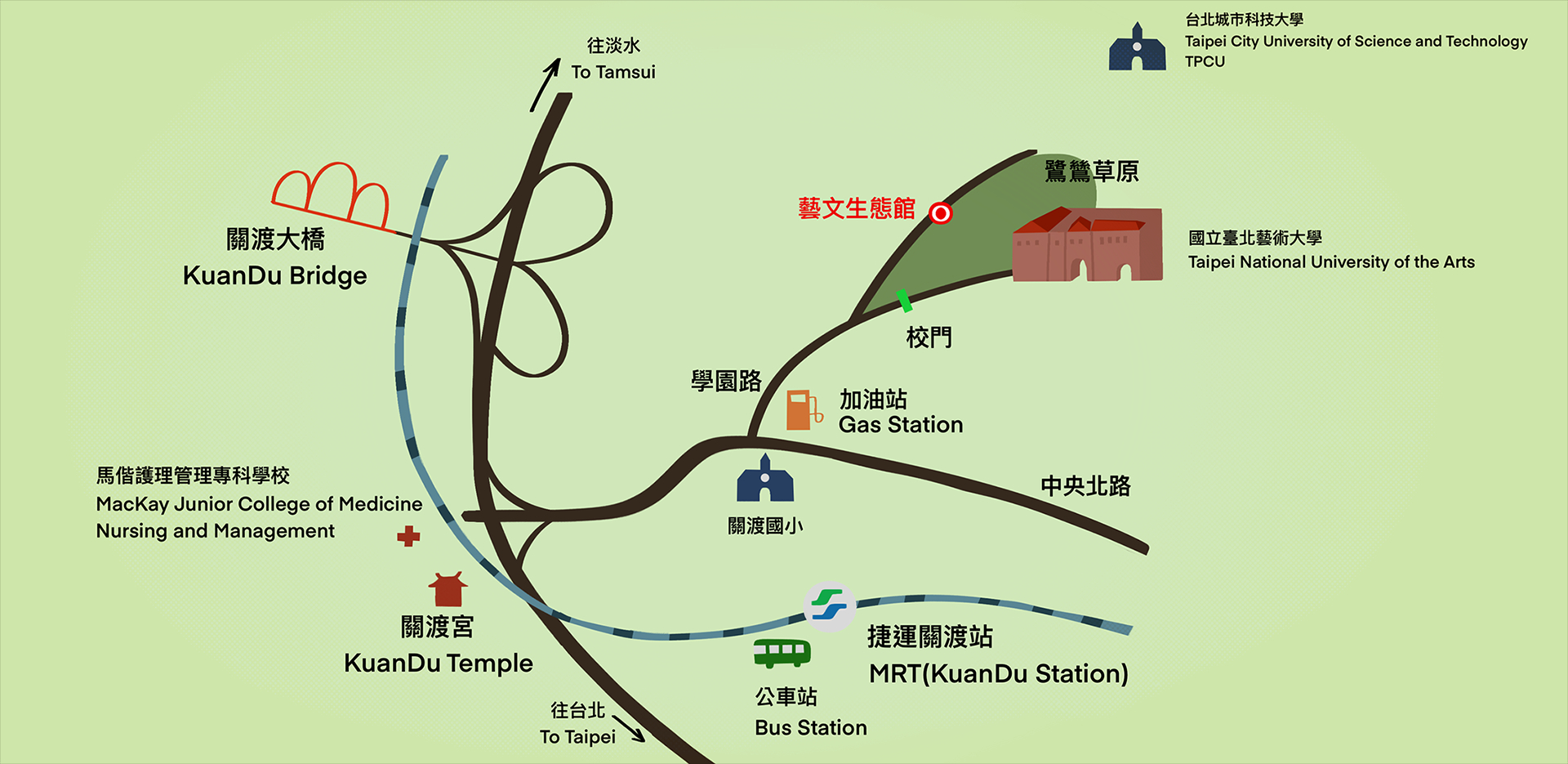 捷運淡水線至關渡站下,可由一號出口搭乘北藝大接駁車、紅35或紅55公車,至北藝大藝文生態館站或鷺鷥草原站下車,班次請參考「公車資訊」。接續步行請在捷運關渡站下車。步行由2號出口出站,沿關渡國小走到中央北路,往中油加油站旁的學園路走,約15分鐘抵達(依指標)。